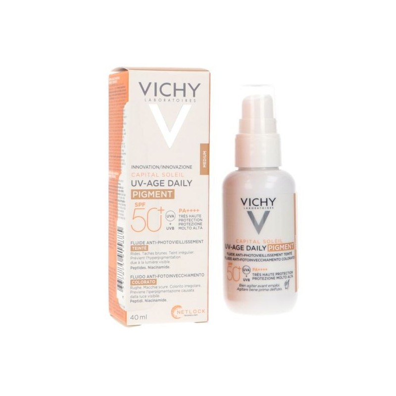 Vichy capital soleil spf50+ uv-age fluido antiedad arrugas y manchas 40ml, es una protección solar para uso diario uv-age daily proporciona protección muy alta frente a los rayos uva, uvb spf 50+ y la luz visible para prevenir la aparición de arrugas y manchas.